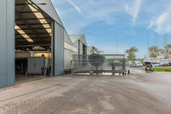 Het aan de bedrijfshallen grenzende buitenterrein (circa 6.870 m²) is grotendeels verhard middels asfalt, beton en stelconplaten (circa 5.570 m²). Dit is inclusief de afspuitplaats (circa 130 m²) met een vloeistofdichte vloer en bezinkput. Hier worden alle jachten afgespoten alvorens binnen of buiten gestald te worden. Voor buitenstalling en manoeuvreerruimte resteert circa 5.440 m²; dit biedt plaats aan circa 50 jachten.